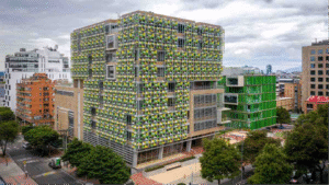 Edificio CAF Colombia: CAF Bogotá estructuró un nuevo edificio alineado con su estrategia de sostenibilidad, orientado a financiar el desarrollo en Latinoamérica. El proyecto integró transición energética justa, resiliencia y ecosistemas, bienestar social inclusivo y una infraestructura física y digital avanzada. Implementó energía renovable, eficiencia energética, gestión inteligente de recursos y movilidad sostenible, con énfasis en reducción de residuos y economía circular. Buscó conectar técnicas de diseño, innovación y accesibilidad con impactos positivos en la comunidad y el entorno urbano. Además, se alineó con los ODS y políticas colombianas para un desarrollo bajo en carbono y resiliente. |